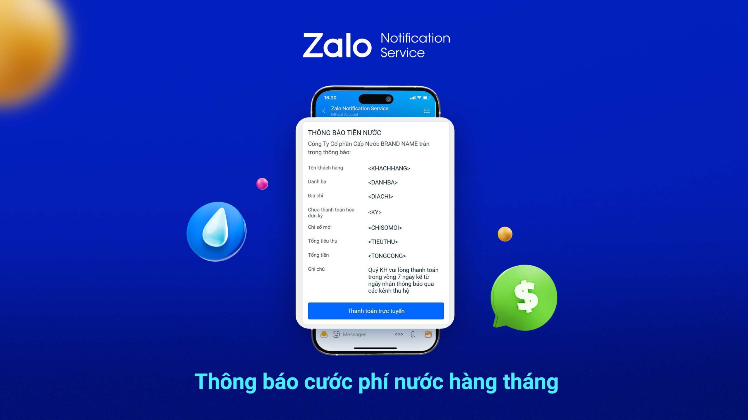 Zalo Notification Service (ZNS) là một giải pháp tối ưu trong việc gửi thông báo cước phí đến hàng triệu người dùng, không chỉ giúp doanh nghiệp quản lý cước phí hiệu quả hơn mà còn tạo ra trải nghiệm tích cực cho khách hàng. Dưới đây là một số ví dụ về cách ZNS được sử dụng trong lĩnh vực này: