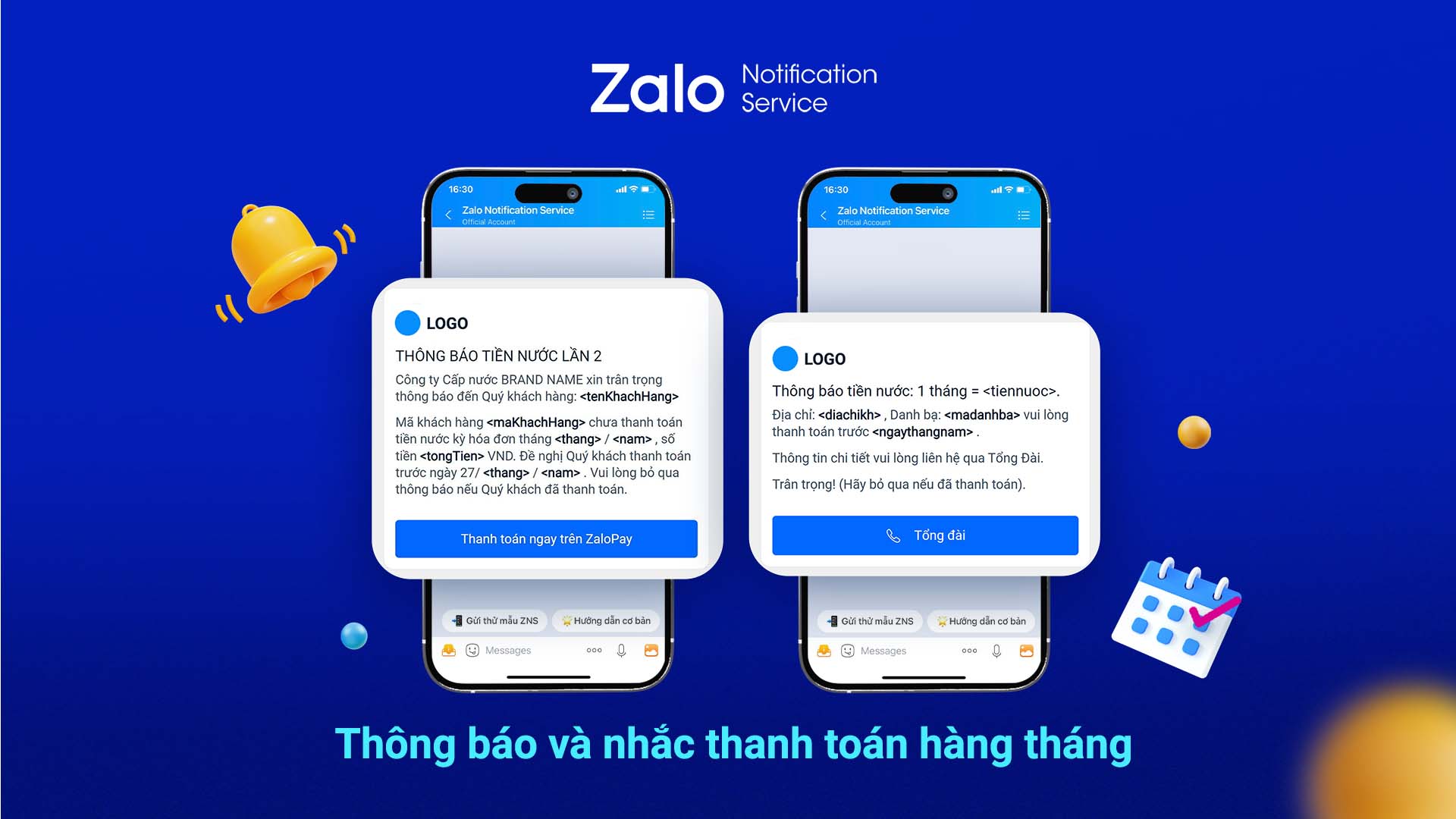 Thông báo cước phí hàng tháng: Các doanh nghiệp dịch vụ điện thoại di động, internet hay những doanh nghiệp cung cấp điện nước thường phải gửi thông báo cước phí hàng tháng đến hàng triệu khách hàng. ZNS hỗ trợ các doanh nghiệp này tự động tạo các tem ZNS và gửi thông báo này, điều này giúp doanh nghiệp tiết kiệm cả thời gian lẫn nguồn lực. Thông qua ZNS, các thông báo này có thể được gửi dưới dạng tin nhắn văn bản, kèm theo các đường dẫn đến hóa đơn điện tử, cung cấp đầy đủ thông tin để khách hàng thuận tiện trong tra cứu và thanh toán.